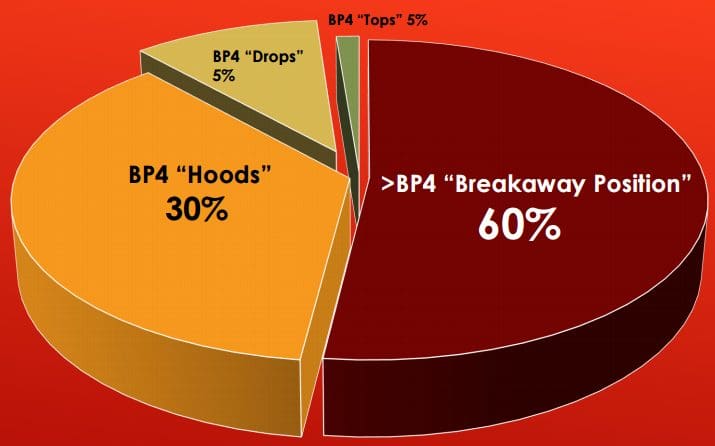 Based on rider feedback, BP4 states that riders are more comfortable in the breakaway position and are therefore spending a majority of their time riding with their hands on the breakaway bend. Based on rider feedback, riders are spending 60% of their time riding in this position. Riders reported spending 80% of their time riding on the hoods on their traditional bars.